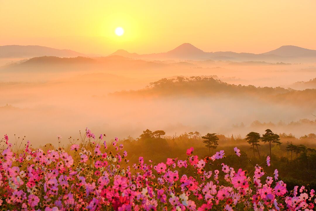 日の出とともに広がる幻想的な丘の景色。雲海、そしてコスモス畑、朝の美しい風景。一日の始まりを特別なものに感じさせてくれる景色は、あなたに幸運を運ぶかもしれません。